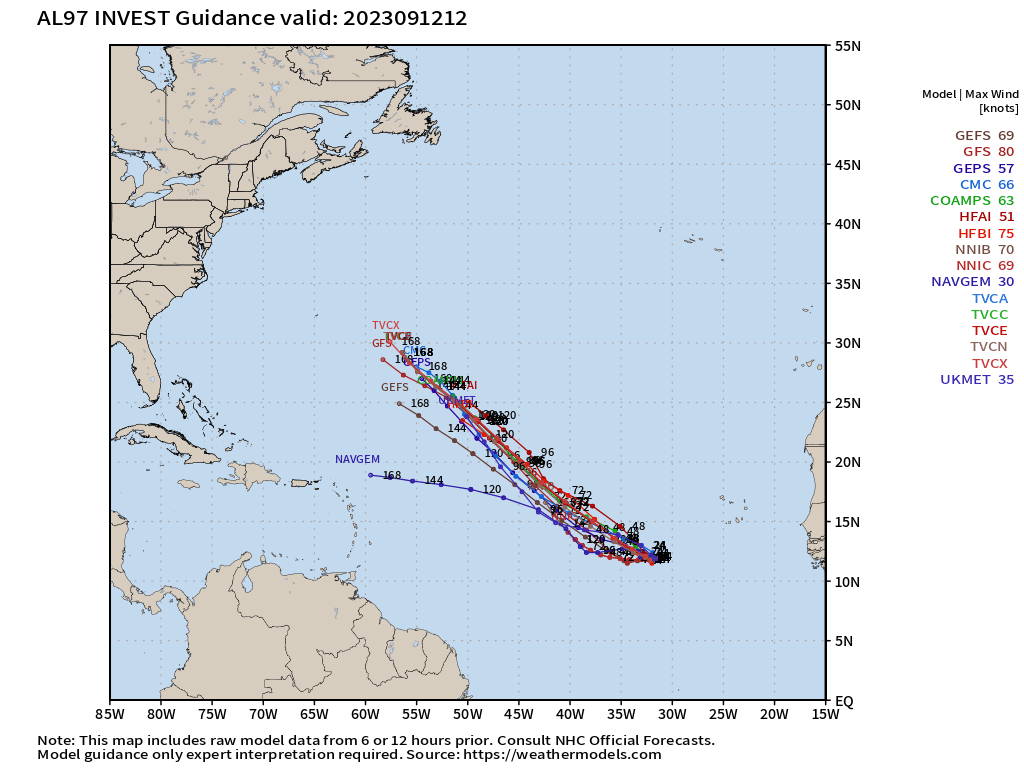 Historically, tropical cyclones of any strength that are located where Lee currently is have a less than 5% chance of making landfall in New England. Image provided by Florida State University,
