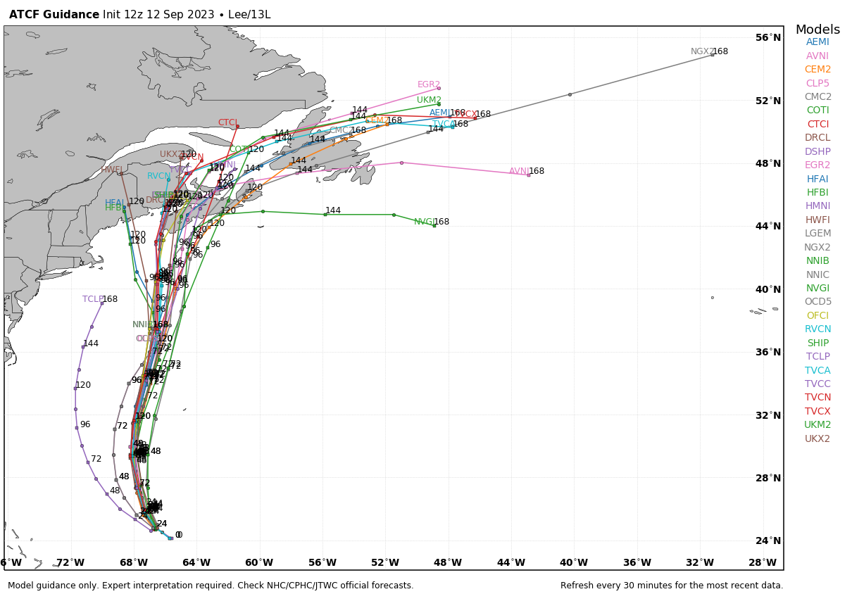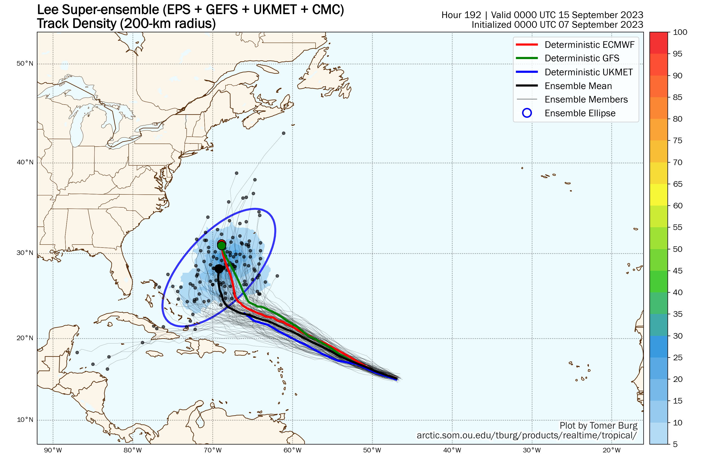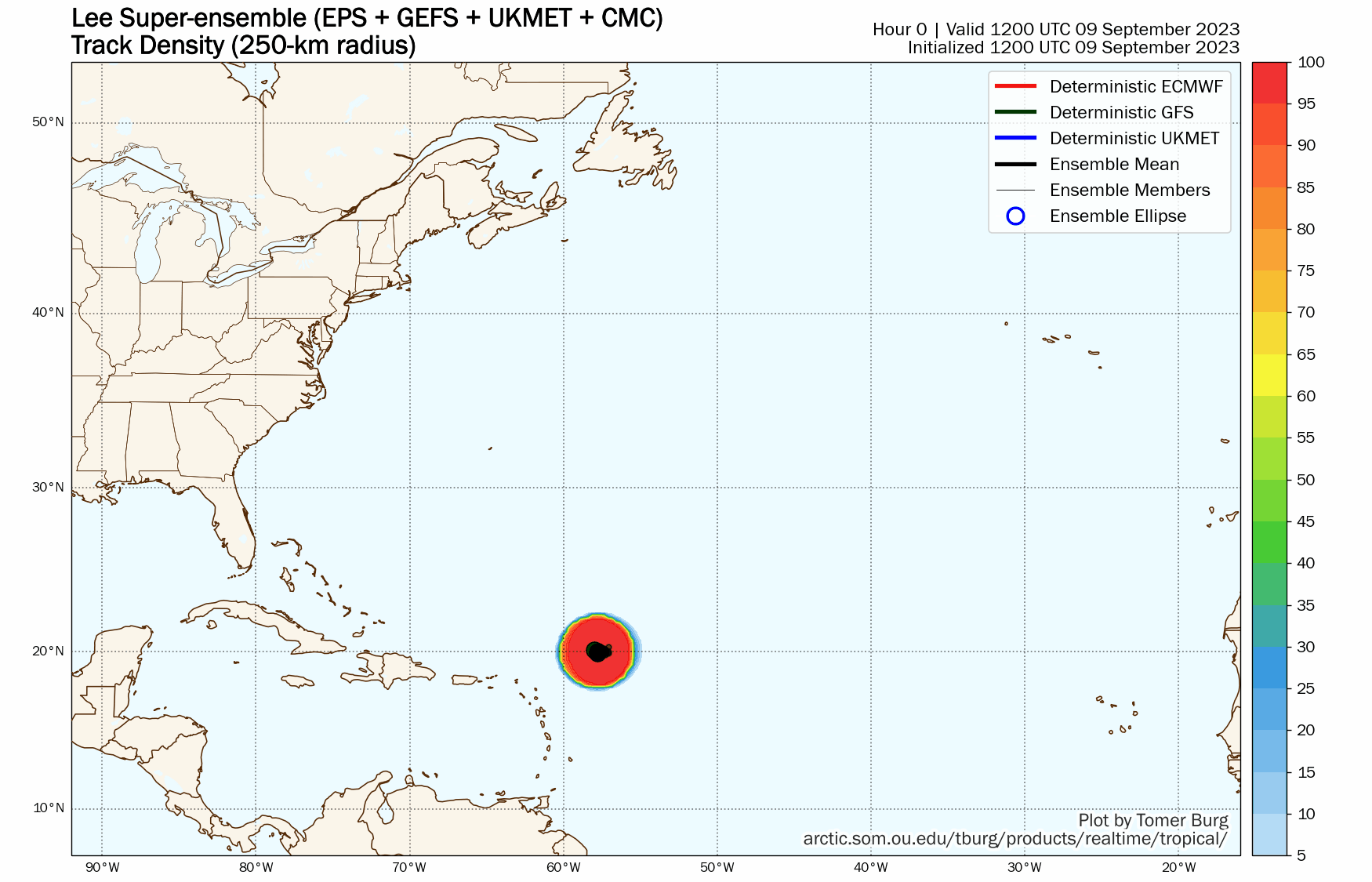 Ensemble forecasts for the track of Hurricane Lee over the next week. Image provided by Tomer Burg