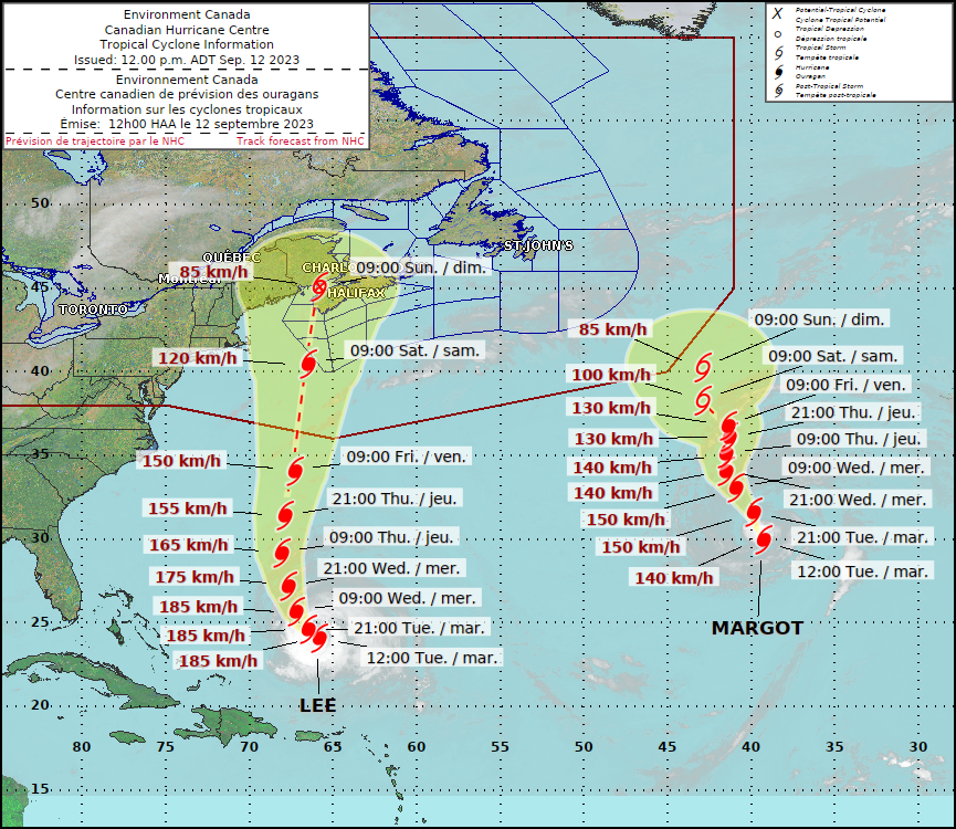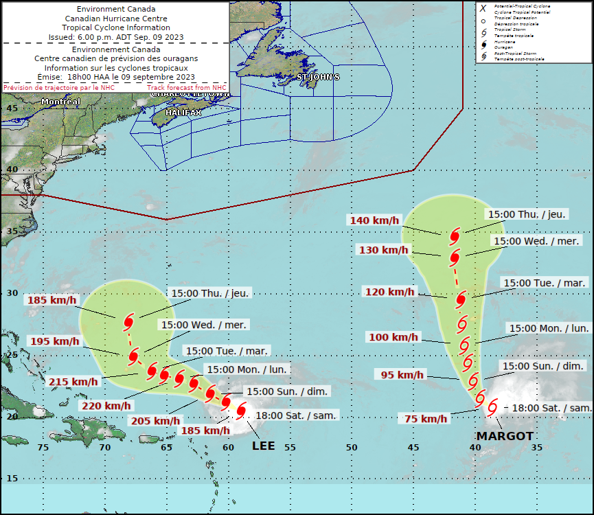 Hurricanes Lee and Margot continue to make their way across the Atlantic. Image provided by Environment Canada.
