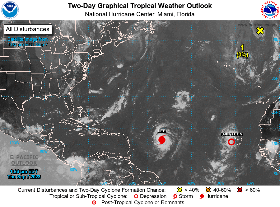 Hurricane Lee was joined by Tropical Depression 14 this afternoon. Image provided by the National Hurricane Center.