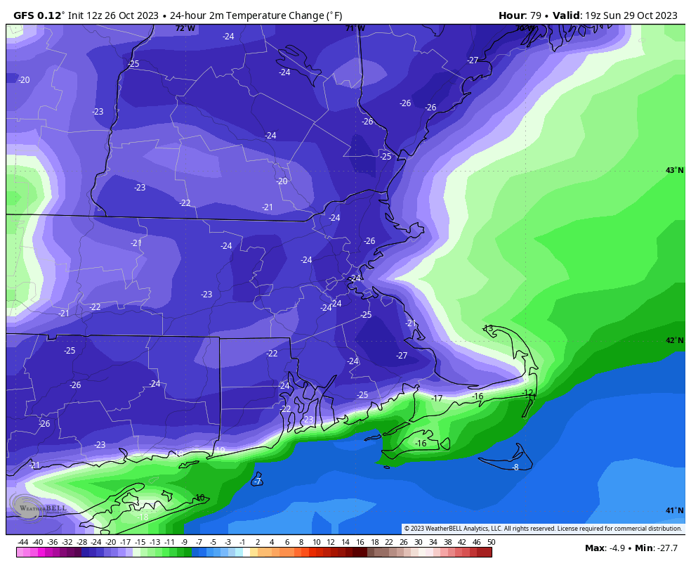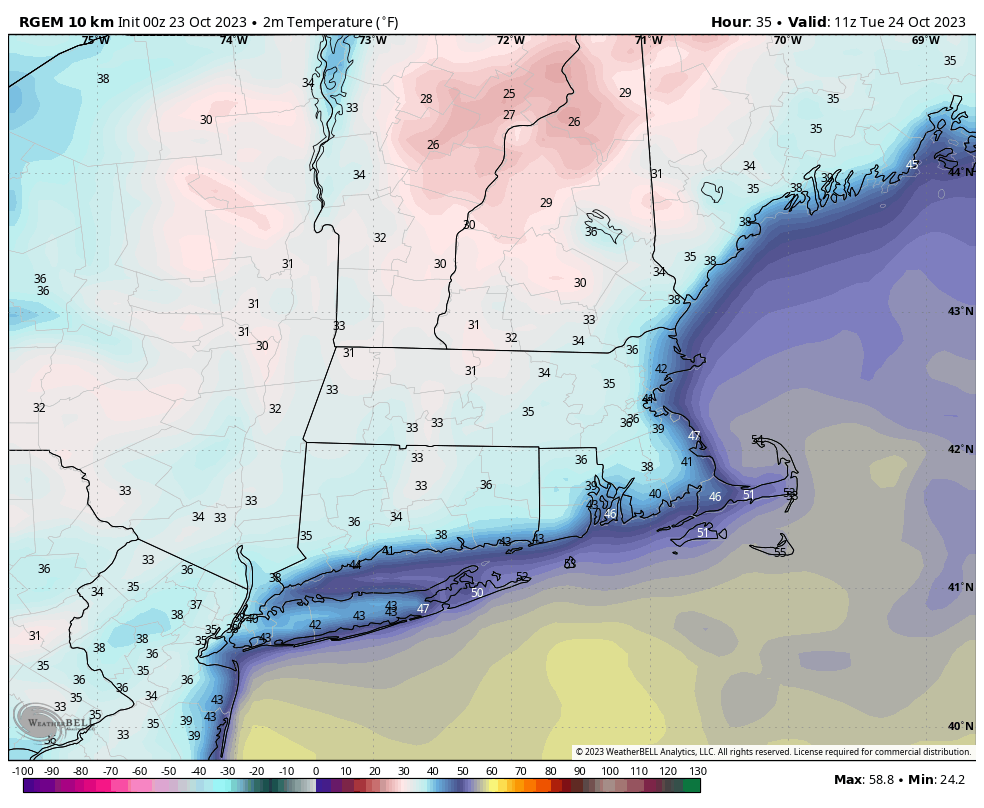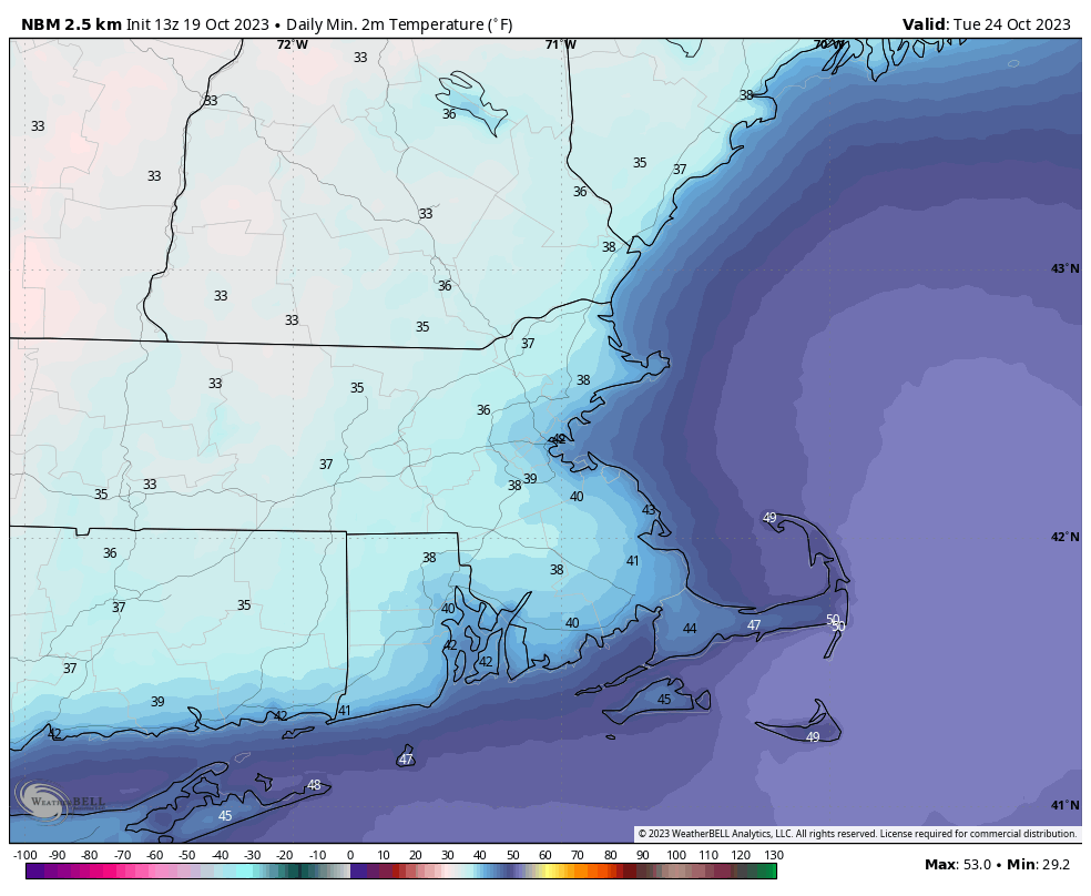 Tuesday night: Becoming partly to mostly cloudy with showers developing across southeastern Massachusetts late at night. Low 30-37.