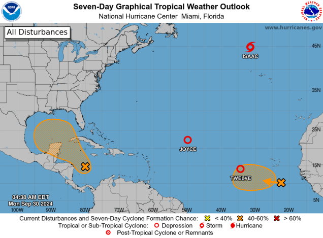 As for the tropics, we have three active systems right now, and another could be on the way. Tropical Storm Isaac was centered about 515 miles north-northwest of the Azores as of 5am Monday, moving toward the east-northeast at 15 mph. Maximum sustained winds were down to 65mph. Isaac should become extratropical later today while heading northeastward over the open waters of the North Atlantic. Tropical Depression Joyce is centered about 910 miles east-northeast of the Northern Leeward Islands, moving toward the west at 2mph. Maximum sustained winds were down to 35 mph, and the storm is expected to turn northward and dissipate over open water in the next day or two. Tropical Depression 12 is centered about 690 miles west of the Cabo Verde Islands, moving toward the west at 8 mph. Maximum sustained winds are near 35 mph. The system should quickly strengthen, becoming a tropical storm later today, and a hurricane in the next couple of days. It could become a rather potent storm later this week, but it should turn more toward the northwest, not impacting any land areas at all.