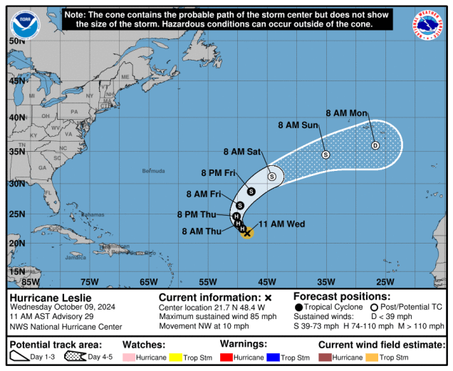 Milton isn’t the only active storm right now. We also have Hurricane Leslie, centered about 985 miles east-northeast of the Northern Leeward Islands, moving toward the northwest at 10 mph. Leslie weakened to a tropical storm on Tuesday, but has regained hurricane strength, with maximum sustained winds near 85 mph. Leslie may strengthen a little more tonight and Wednesday before a weakening trend commences. Leslie should turn more toward the north and northeast, remaining over open water while steadily weakening over the next few days, before becoming extratropical this weekend.
