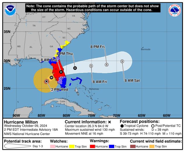 After peaking as a Category 5 hurricane twice over the past few days, Hurricane Milton is starting to weaken, and will continue to do so right up until landfall along the Florida Gulf Coast tonight. As of 3pm EDT Milton still had maximum sustained winds near 130 mph, and was centered about 110 miles west of Ft. Myers, Florida, moving toward the northeast at 16 mph. A variety of watches and warnings are in effect for most of Florida as well as parts of the Bahamas and Southeast coastline.