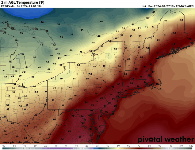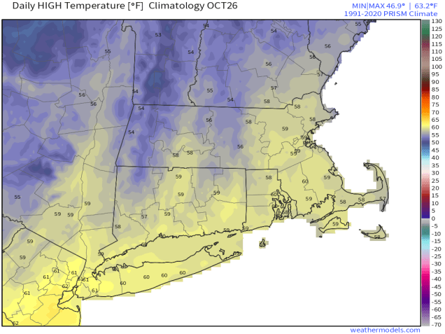 Average high temperatures for late October are in the upper 50s. Image provided by Weathermodels.com