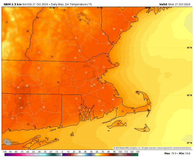Monday: More sunshine. High 70-77, coolest across Cape Cod.