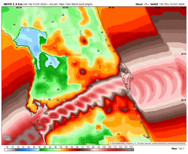Milton has already begun to transition into an extratropical system, and by the time it moves into the Atlantic Thursday morning, that transition should be nearly complete. Unfortunately, this will result in Milton becoming and even larger storm, and the strong winds, albeit weaker than they are now, spread out over a much larger area. While the winds will result in widespread damage, especially near landfall, the strongest winds should stay south of Tampa, Orlando, and Daytona Beach. These areas may see gusts to hurricane strength, especially in Tampa, but wind will not be the biggest concern here.