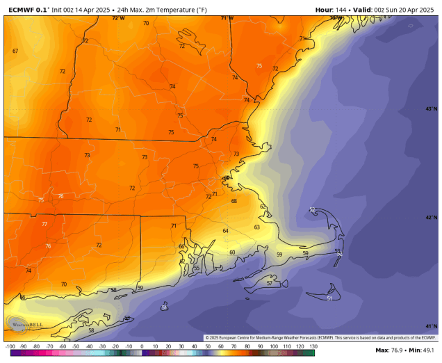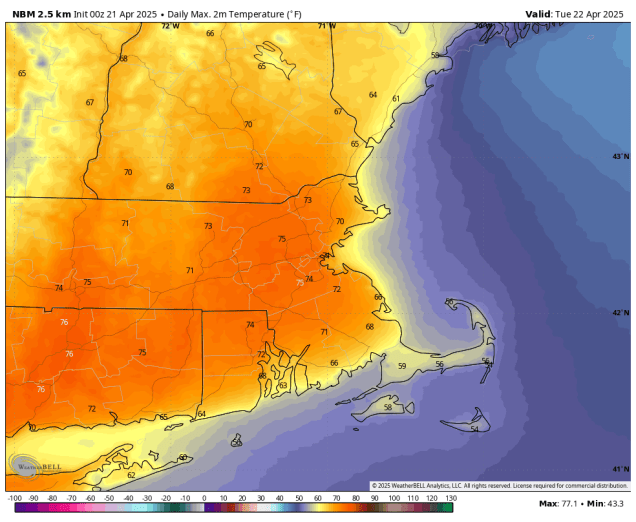 Monday: Plenty of sunshine. High 65-72, cooler across the Cape and Islands.