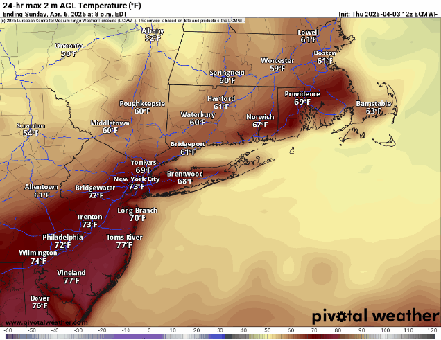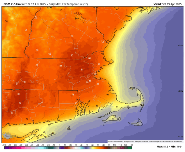 Friday: Partly sunny with some haze or smoke around in the morning, clouds thicken up during the afternoon. High 72-79 inland, 64-71 along the coast, a little cooler across the Outer Cape and Islands. Temperatures may turn cooler for a while in the afternoon from Boston northward, especially along the coast.