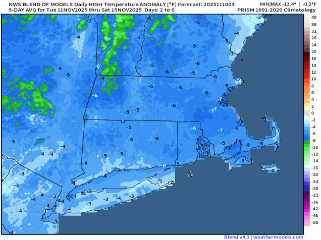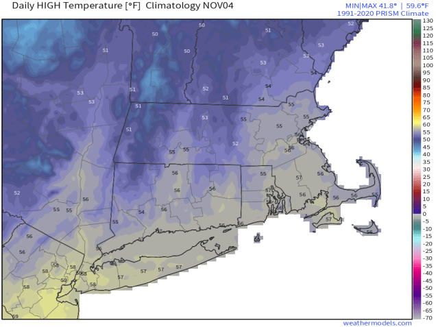 A cold front will cross the region tonight, produce a few showers this evening, then bringing an end to the mild weather we enjoyed today. Blustery and colder weather settles in for Thanksgiving Day, with skies becoming partly sunny. Friday looks to be similar, but a few degrees colder. A few stray snow showers are also possible on Friday, as a weak disturbance may help some of the streams of lake-effect snow survive this far east. High pressure brings sunshine and lighter winds on Saturday, but it will still be quite cool, even by late November standards. Temperatures start to moderate on Sunday as the high shifts off to the east, but the next system will be headed our way with plenty of clouds, and likely some rain by late afternoon. Rain is likely Friday night, ending Monday morning, with some sunshine developing Monday afternoon.