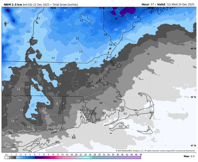 Tuesday night: Any lingering snow or rain showers ending, some clearing possible late at night. Total snow accumulation 1-3 inches for most spots, less than 1″ near the South Coast and Cape Cod. Low 24-31.
