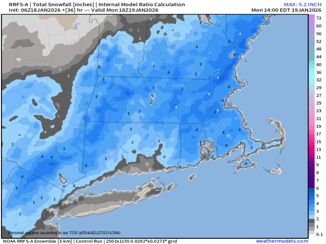 In general, we’re looking at 3-5 inches. of snow for much of eastern Massachusetts, with a few heavier amounts possible. As you head farther north into the Merrimack Valley and Southern New Hampshire, as well as across parts of Cape Cod, totals will be a little lighter, generally 1-3 inches.