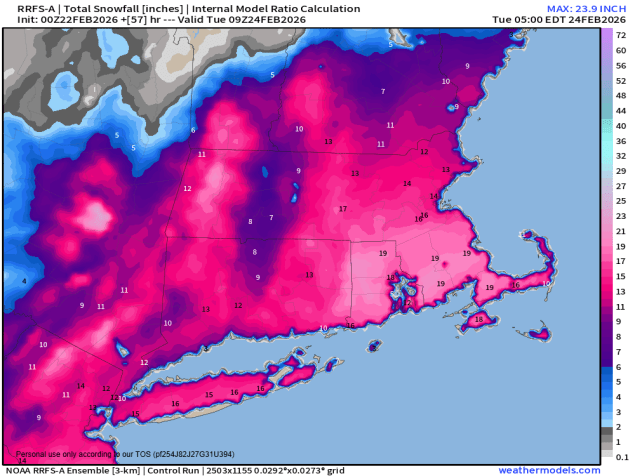 So, how much snow are we expecting? There are plenty of people out there more than willing to share model forecast maps showing widespread 20-30 inch amounts, but we’re not buying that. As a colleague of ours pointed out online earlier, this will be a heavy, wet snow, so it won’t pile up as quickly (but will be a huge pain to shovel!), plus, there probably won’t be enough precipitation to generate that much snow. Could it happen? Sure, it could, but right now, we’re not expecting. What we are expecting is widespread 12-20″ across most of eastern Massachusetts and Rhode Island, with 8-14″ across southern New Hampshire. As is usually the case, there will be some isolated heavier amounts in these regions where bands of heavy snow stick around a little longer.