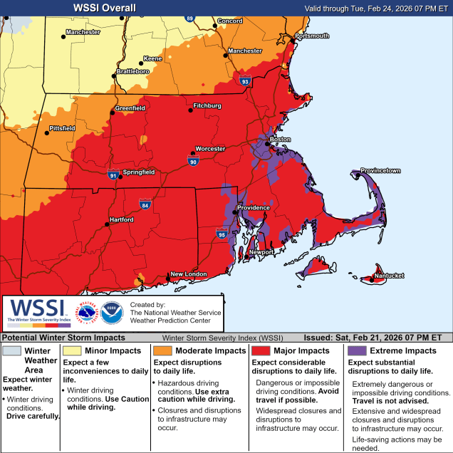 When you factor in the wind, we’ll have blizzard conditions, especially near the coast, where Blizzard Warnings have been issued. The amount of snow a storm produces has nothing to do with whether it is a blizzard or not. In fact, you can have Blizzard conditions without any snow falling at all! To qualify as a blizzard, you must have sustained winds of 35 mph or frequent gusts to 35 mph or more AND visibility of 1/4 mile or less for 3 consecutive hours. We could very well get this combination, especially along the coast, Monday morning. Travel is not recommended on Monday at all, at least until conditions start to improve late in the day.