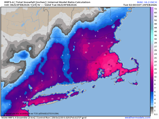 Intensifying low pressure passes south and east of New England today with heavy snow, strong winds, and coastal flooding likely. The snow will be heavy through the morning, then start to taper off in the afternoon, ending during the evening. We’re looking at 10-18 inches across much of the region, a little less across southern New Hampshire, on the order of 6-10 inches. Winds will gust to 30-50 mph inland, and 50 to perhaps 70 mph along the coast, with significant blowing and drifting snow likely. Temperatures will slowly fall during the day, so the snow will become a little fluffier, allowing the blowing and drifting to become more of an issue. Winds will start to diminish later today as the storm pulls away, but it will remain breezy into Tuesday morning. High pressure builds in with some sunshine returning on Tuesday, but it won’t last too long. Clouds come right back at night as an Alberta Clipper heads our way. Some light snow will develop towards daybreak on Wednesday, ending by early afternoon. Temperatures may be marginally warm enough for the snow to mix with or change to rain south of the Mass Pike. Overall, with it being a weak and fast-moving storm, we’re not expecting more than 1-2 inches of snow anywhere.