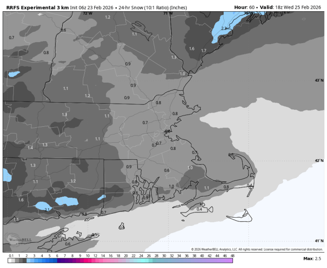 Wednesday: Light snow or snow showers, possibly mixed with rain south of the Mass Pike, ending in the afternoon. Accumulations of a coating to 2 inches possible. High 32-39.