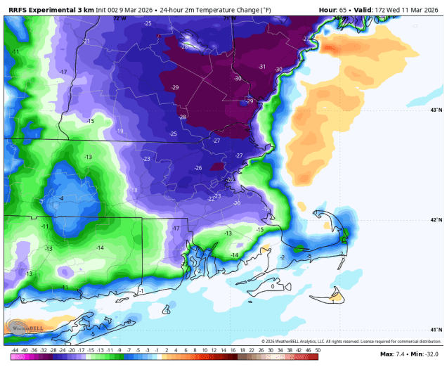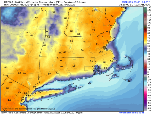 Wednesday: Becoming mostly cloudy and breezy. High 51-58, warmer inland, especially well south and west of Boston.
