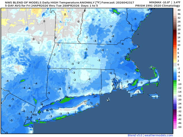 An upper level low pressure system over Atlantic Canada will keep us on the cool side through the weekend while high pressure builds in at the surface. Low pressure moving out of the Great Lakes will be deflected south and west of New England, spreading some clouds in, but the rain shield associated the system looks like it won’t make it past Connecticut. At least, that’s what some of our more reliable models are showing. However, not all of the models see it that way, and there’s where things get complicated. Some of the models bring the storm south of the region, but close enough to bring the rain shield into the South Coast and Cape Cod. Others slow the system down, then have it redevelop as a new upper level low pressure area develops just offshore, resulting in some steadier and heavier rain for much of eastern New England Sunday and Monday. With all of this in mind, we also are reminded of an old meteorological saying – “When in drought, leave it out”. What this means is that droughts tend to feed on themselves – when it’s dry, it stays dry, so leave the rain out of the forecast. We’ve been in a drought for a while now, so with all of this in mind, we are going to lean toward a drier forecast for now, but are well aware that it could change for the latter half of the weekend. We’ll also note that many models are showing the potential for a very wet period for the middle to latter half of next week, which we’ll take a deeper dive into in our Weekly Outlook early Monday morning.