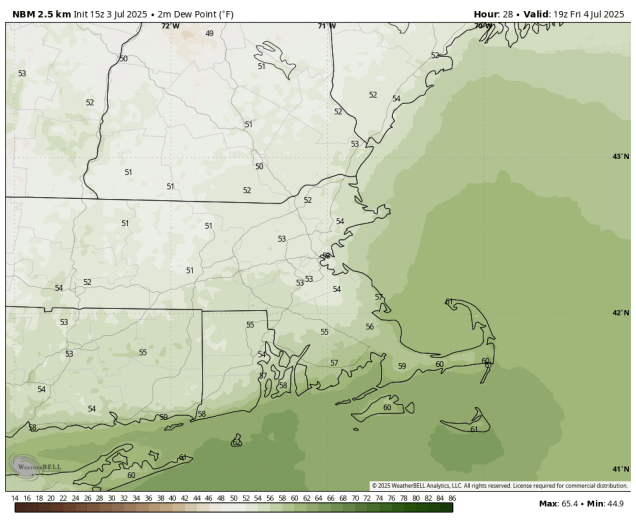 Monday night: Clear skies north and west of Boston, partly to mostly cloudy south with a few showers or drizzle possible. Low 34-41, a little milder across Cape Cod.