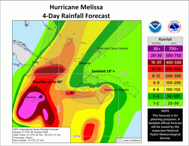 In the Caribbean, Hurricane Melissa is assaulting Jamaica and nearby portions of Cuba and Haiti, and this will continue for another day or two. As of 2am, Melissa was centered about 130 miles south-southwest of Kingston, Jamaica, drifting toward the west at 5 mph. Maximum sustained winds were near 150 mph, making Melissa a Category 4 storm. Unfortunately, the forecast for Jamaica is rather grim. Melissa will drift westward for another day or so, with some additional strengthening expected. That means rain and strong winds will continue to increase across Jamaica. By Monday night, the storm will start to turn more toward the north as a trough of low pressure off the Southeast begins to pick the storm up. That means it will likely cut right across the island, possibly as a Category 5 storm. In addition to sustained winds possibly in excess of 150 mph, a storm surge of up to 15-20 feet east of the center will likely result in widespread damage, including the capital city of Kingston. On top of that, rainfall totals of 20-40 inches (or higher) will result in catastrophic flooding and mudslides. Torrential rain and strong winds are also likely across portions of Haiti and eastern Cuba, especially as Melissa turns northward towards these areas. It will then cross the Turks and Caicos and parts of the Bahamas as it continues to slowly weaken. By mid-week, it could be a threat to Bermuda as well, possibly still at hurricane strength.