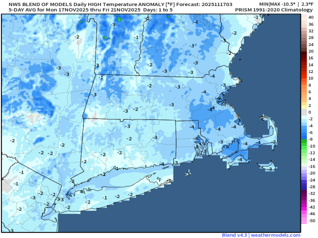 The big question that we can’t answer yet is “where does that area of low pressure go?” Some models keep it well to the south, with little to no impact for our area, maybe a little snow near the South Coast and Cape Cod. Some bring it farther north, with light snow as far north as the Mass Pike, maybe even a little farther north than that. If it is far enough north, this could result in some rain across parts of the Outer Cape and Islands. If this weren’t the first accumulating snow for many areas south of Boston it wouldn’t be a big deal, and in fact, it really isn’t a big deal. Right now, we expect some light snow and snow showers to develop before daybreak Sunday, continuing off and on through the day, ending towards evening. Obviously this is highly uncertain, and we’ll likely issue a special blog post on Saturday if things look different. We expect most of the accumulating snow south of Route 2, likely south of the Mass Pike. The highest accumulations will likely be across parts of southeastern Massachusetts and Rhode Island, but even there, we’re thinking 2-4 inches at most. Breezy and colder weather returns behind the system on Monday.