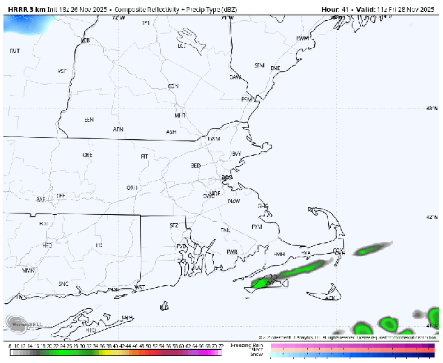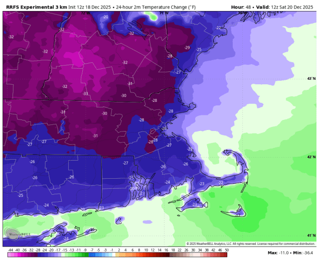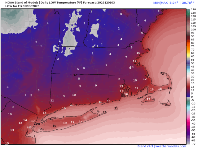 An arctic cold front crossed the region this evening, producing some snow showers and squalls as it moved through. Behind it, much colder air is going to settle in tonight on gusty northwest winds. By Friday morning, temperatures will be in the single numbers and teens across most of the region, with some subzero readings possible in areas with fresh snowcover. Despite some sunshine on Friday, temperatures will only get into the 20s and lower 30s as winds die down, but clouds will quickly return ahead of another weak system. That system will pass south of the region Friday night and early Saturday, keeping the bulk of the precipitation offshore, but a trough extending from the system may produce a few snow showers. Across eastern Massachusetts and Cape Cod it should be mild enough for rain showers instead We’ll clear out Saturday night, then Sunday should be a decent day for early December, but another strong cold front moves through at night. This one will also produce some snow showers, and behind it we’ll turn rather cold again behind that front on Monday.