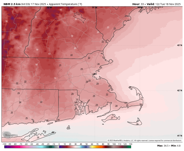 Wind chills will be in the 20s when you head out the door Tuesday morning. Image provided by WeatherBell.