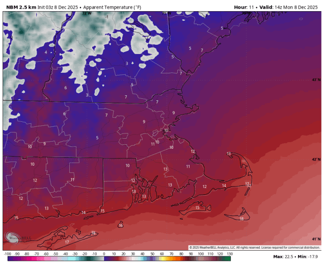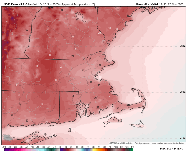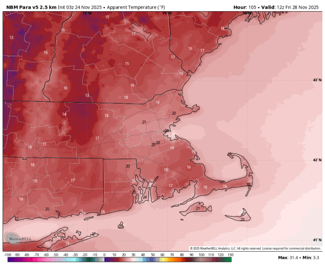 Wind chills will be in the upper teens and lower 20s Friday morning. Image provided by WeatherBell.