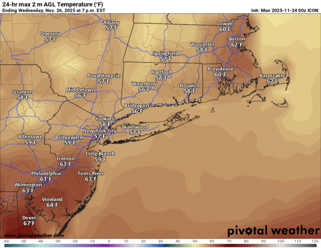Temperatures could reach 60 around here Wednesday afternoon. Image provided by Pivotal Weather.