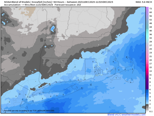 This storm will not be that big of a deal for most of us, and shouldn’t have too much of an impact on the region, though if you’re heading to and from Foxborough there will be a bit more of an impact. If you’re arriving early to tailgate, expect to do it in the snow. As for the game, the snow should be winding down towards halftime, but for the 2nd half it’ll be windy and turning colder, so plan ahead for that it you’ll be sitting in the stands.