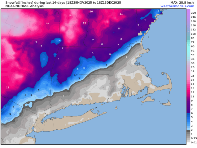 Areas well north and west of Boston got their first snowstorm about 10 days ago. Image provided by Weathermodels.com