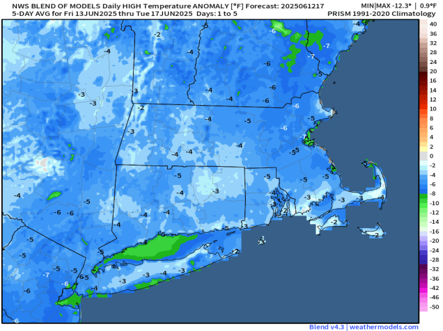 After a warm day today we have a cold front moving through with just some clouds and possibly a stray shower through the evening. That front will settle just offshore and stall out, with cooler weather filtering in behind it for Friday, with temperatures running 10-15 degrees cooler than today, close to or a little below where we should be in mid-June. Friday should be dry, with sunshine filtered through some high clouds. A weak area of low pressure will ride along the front Friday night and early Saturday, bringing some rain into the region along with rather cool conditions. The rain should taper off during the morning, but east winds off the Atlantic will keep clouds in place Saturday afternoon with a little drizzle at times, and temperatures only in the 60s, possibly upper 50s near the coast. For Sunday and Monday, we’ll be stuck in between high pressure to the north and another weak low pressure system riding along that front to our south. The result will be plenty of clouds, possibly a few showers, and temperatures remaining on the cool side, though Monday will likely be a little milder. The good news is that temperatures should warm up quite a bit as we get towards the middle of next week.
