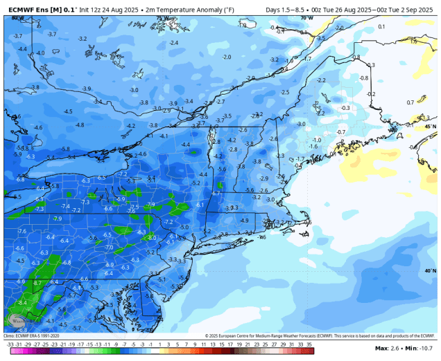 Temperatures will be below normal for much of the upcoming week. Image provided by Weathermodels.com