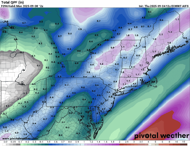 High pressure will slowly build into the region this evening, allowing skies to gradually clear out tonight. With the high in control on Friday we’ll have lots of sunshine, with temperatures getting back close to where they should be in the latter half of August. It will remain breezy, especially during the morning, due to the gradient between the high building in and distant Hurricane Erin pulling away offshore (more on that in a moment). As the high moves off to the east on Saturday, southwest winds will usher warmer air in, with many areas away from the coast likely topping 80 degrees. We’ll see things start to change on Sunday as a cold front begins to slowly approach the region. Clouds will increase, and gusty southerly winds will develop, increasing humidity levels across the area. Some showers and thunderstorms are expected ahead of the front, but they should hold off until evening, so don’t cancel any outdoor plans for Sunday. The front will take its time moving through, with showers and thunderstorms expected for Sunday night into Monday. We’ll also be watching a small area of low pressure moving up the East Coast on Monday. While most of the models keep it far enough offshore to have little to no impact here, some bring it close enough to bring in a periods of steadier rain to Cape Cod and possibly southeastern Massachusetts Monday afternoon and evening. We’re leaning towards it staying too far offshore to impact us, but we are keeping an eye on it just in case.